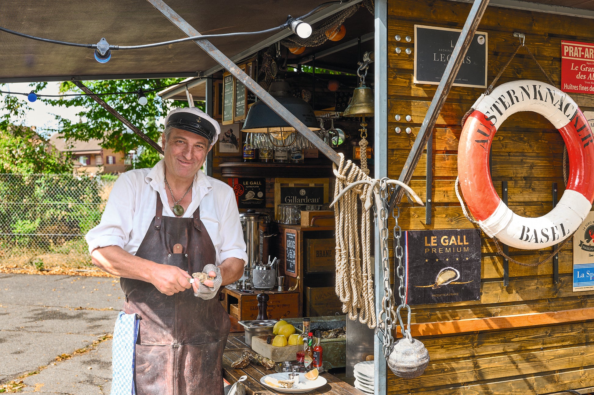 Knack und Schlürf Wer glaubt, alles über Austern zu wissen, hat noch nicht mit Max Läubli geplaudert, der nicht langatmig missioniert, sondern seine Geschichten kurzweilig erzählt. Über Austernarten, Lebenszyklen, Kultivierungsarten, Ökologischem und noch so einigem anderen mehr, zu dem die servierten Austern gleich doppelt so gut schmecken, begleitet von einem Glas Weisswein, oder je nach Vorliebe, von einem dezent perlenden Champagner. Max Läubli kann auch für private Anlässe angeheuert werden, und wer ihn ohne Einladung erleben will, besucht ihn an einem der Basler Quartiermärkte, an denen er meistens präsent ist (vorher seine Website konsultieren). Während der Vorweihnachtszeit findet man ihn in der Rheingasse, was für mich eh die optimalste Zeit ist, Austern zu schlürfen. Für mich am Liebsten mit einem Glas Chenin blanc oder je nach Tageszeit mit einem Cidre aus der Normandie.