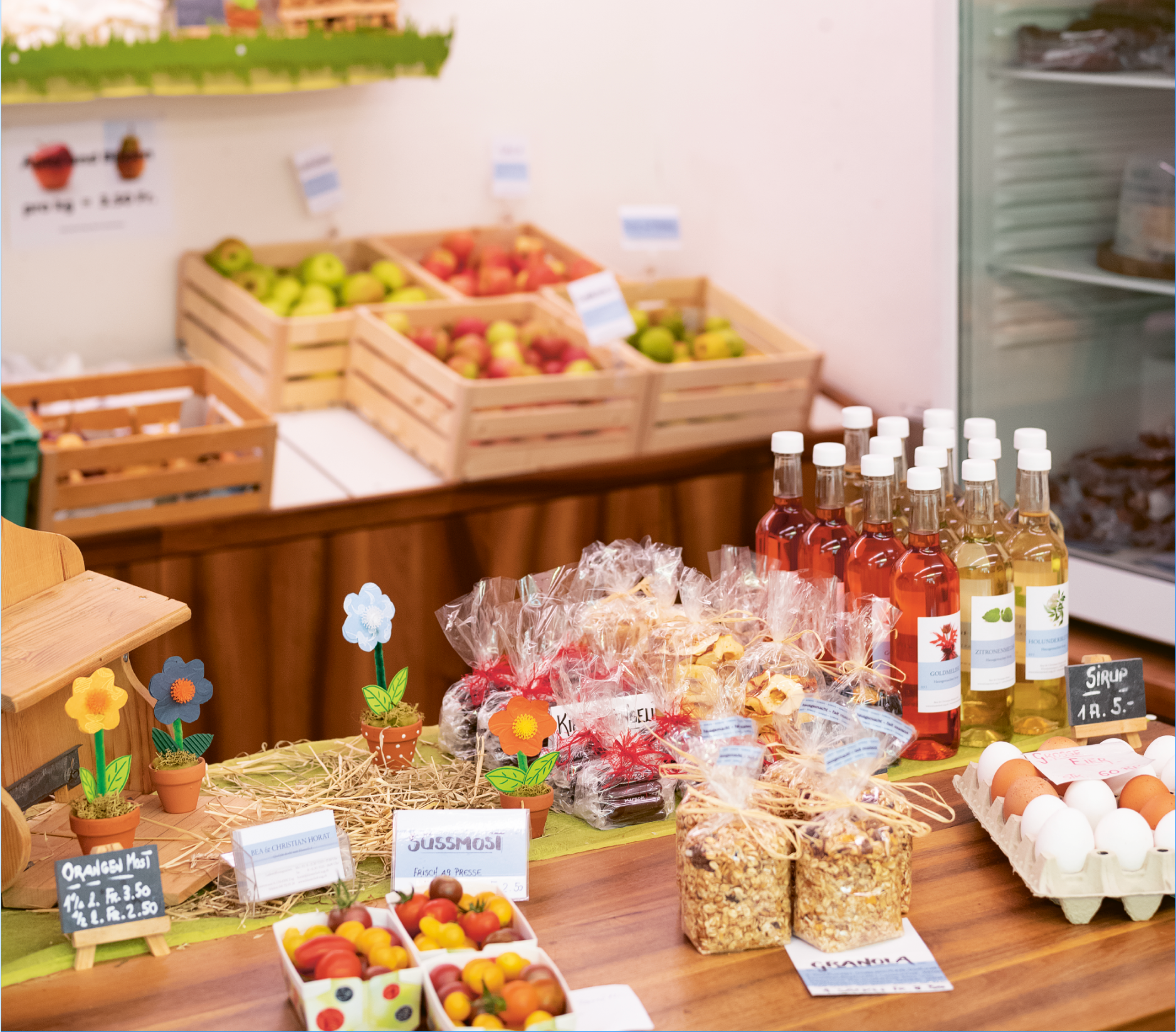 Mittendrin Der Klosterhof umfasst 17 Hektar, und mit dem gepachteten Tschuepishof kommen noch 6,5 Hektar Land hinzu. Zusätzlich arbeitet er mit dem Deinikon-Hof von Christine und Beat Horat zusammen. Der Landwirtschaftsbetrieb, auf dessen Fläche wertvolle Hochstammbäume stehen, nämlich 80 Kirsch-, 250 Zwetschgen-, 80 Apfel- und Birnen- sowie 20 Nussbäume, wird von der Familie Horat-Grob ökologisch betrieben. Auf den Feldern grasen Galloway-Rinder und auf dem Tschuepishof tummeln sich 100 Mutterschafe. 50 Freilandhühner liefern frische Eier, und in der hofeigenen Brennerei werden von der Seniorchefin Destillate gebrannt, allen voran der Kirsch, die wie alle anderen Produkte im Hofladen verkauft werden — so u. a. Konfitüren, Chutneys und mehr.